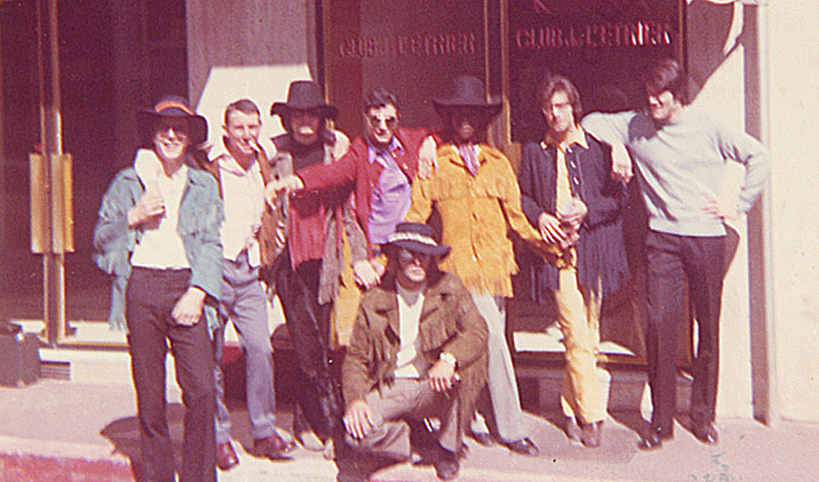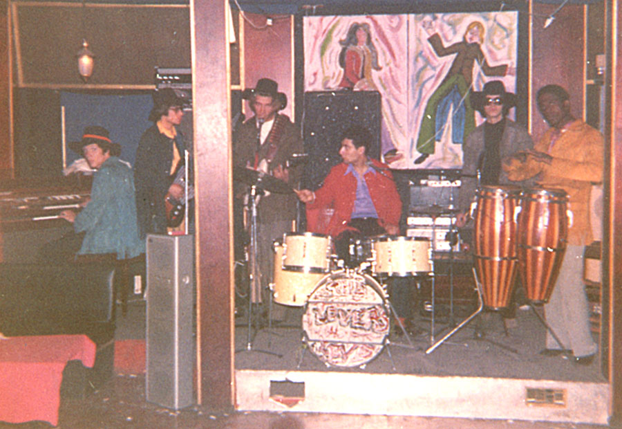 1969 : Club l'Etrier à Cannes : Répétition, de gauche à droite : Gerard Saugrin clavier, Bernard Baverey bass, Gilbert Courtois guitare, Marco Attali, batterie, Jean-Marie Chirigin trompette, Marcel percu, hors chant Bruno Smorto guitare. Photo collection Marco Attali.