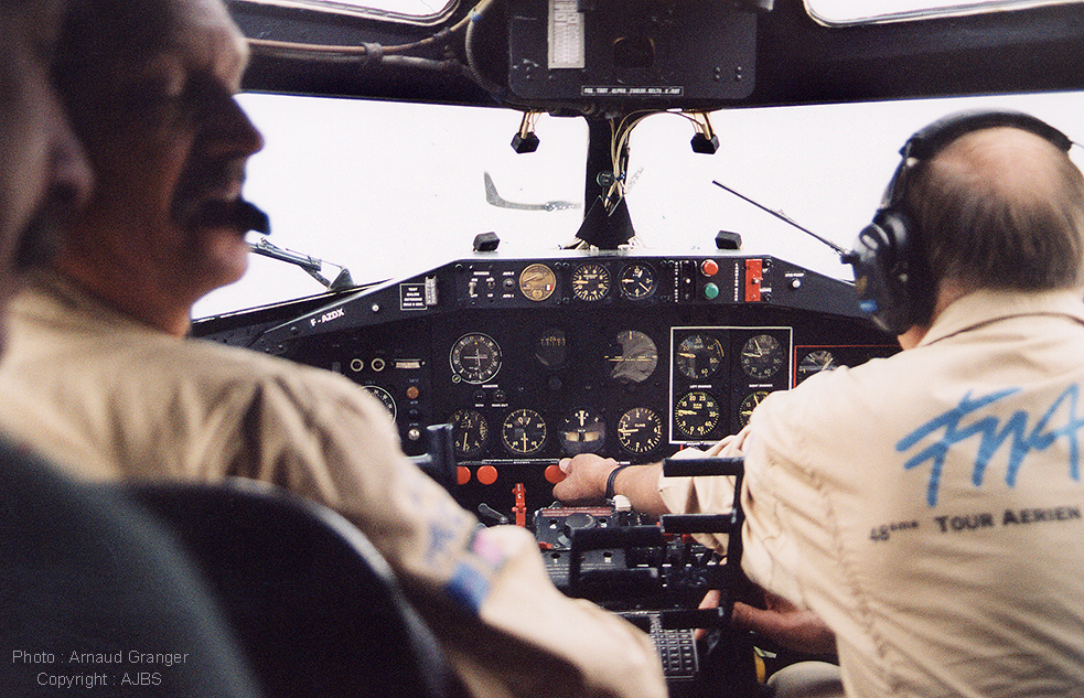 Le commandant André Dominé à gauche, le mécanicien Marcel Pierre à droite, les moustaches de Bernard Vurpillot "co-pilote" à gauche, en vol pour la présentation de Pink Lady en meeting aérien en France.